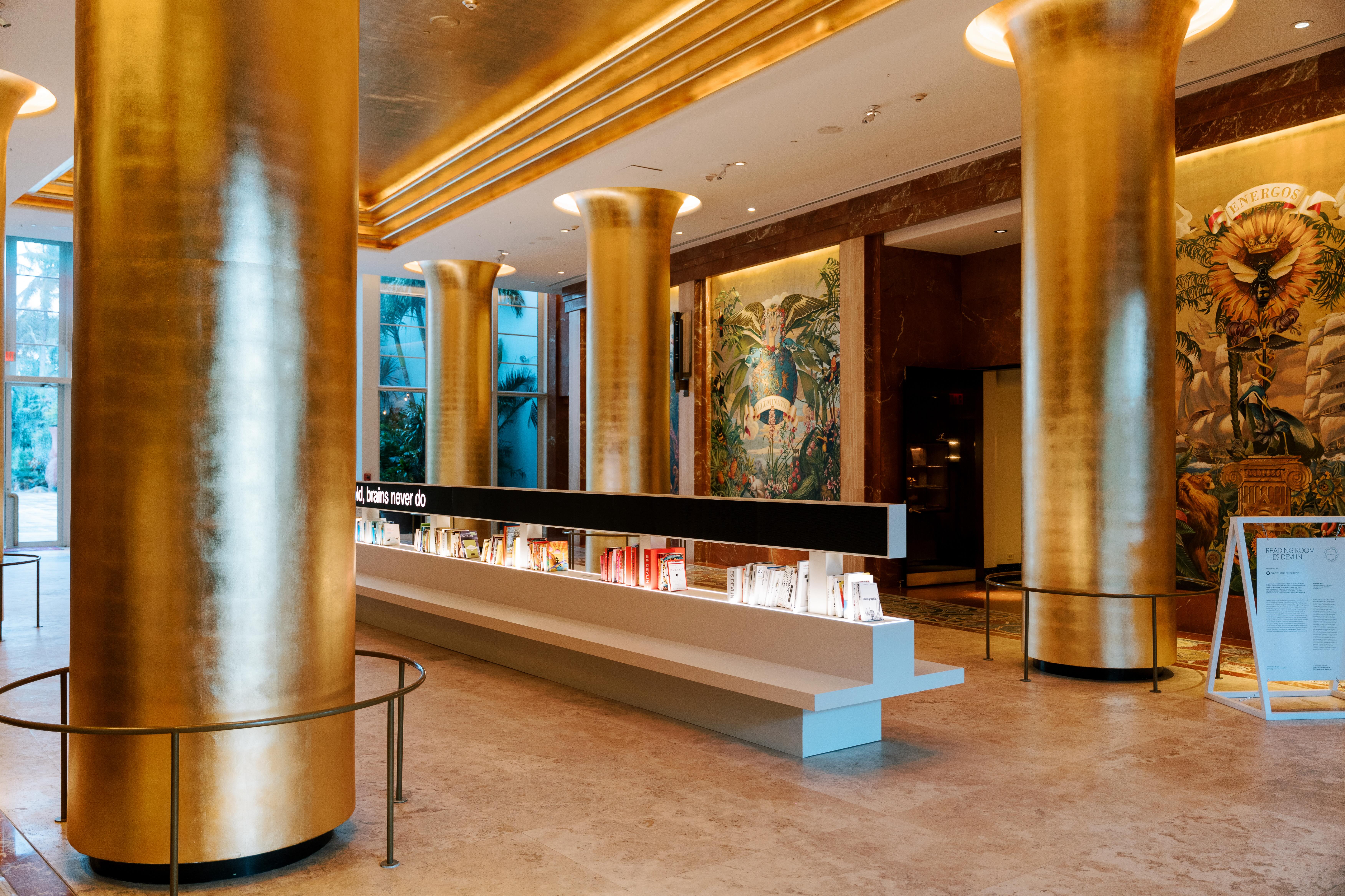 'Reading Room' is a 46 foot bench that combines a bookshelf with an LED text strip, built as a participatory companion to ‘Library of Us’ from contributions by the hotel staff and longtime Faena Art collaborators.